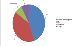 A total of 150 students aged 11-19 years (mean 14.45 + 1.87 years) of both sexes (boys 71: girls 79) participated in the study. The study revealed that 83 (55.33%) adolescents were anaemic. The prevalence of anaemia among study population as per severity is shown in fig.1.