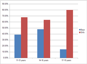 The examination of prevalence of anaemia in different age-groups in two genders revealed that the prevalence does not follow a time-trend, and the variation of prevalence in both sexes among adolescents of different age-groups was statistically insignificant (Fig 2).