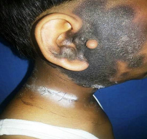 A fourteen year old boy was referred from a private clinic to the Oncology department of our institute for evaluation with a provisional diagnosis of lymphoma. His chief complaints were brownish discoloration of right cheek and nasal bridge which had initially started as a small nodule below the right ear lobule and simultaneous appearance of single left cervical lymphnode (Fig.1). At an outside hospital, FNAC was done from this nodule, and was reported as basal cell adenoma of the parotid gland. Over a six month period, the facial discoloration increased and more cervical lymph nodes appeared. The patient sought treatment at another hospital after two months of initial complaints where a contrast enhanced computed tomography (CECT) of neck showed bilateral parotitis with extensive right cervical lymphadenopathy, possibly of infective origin.